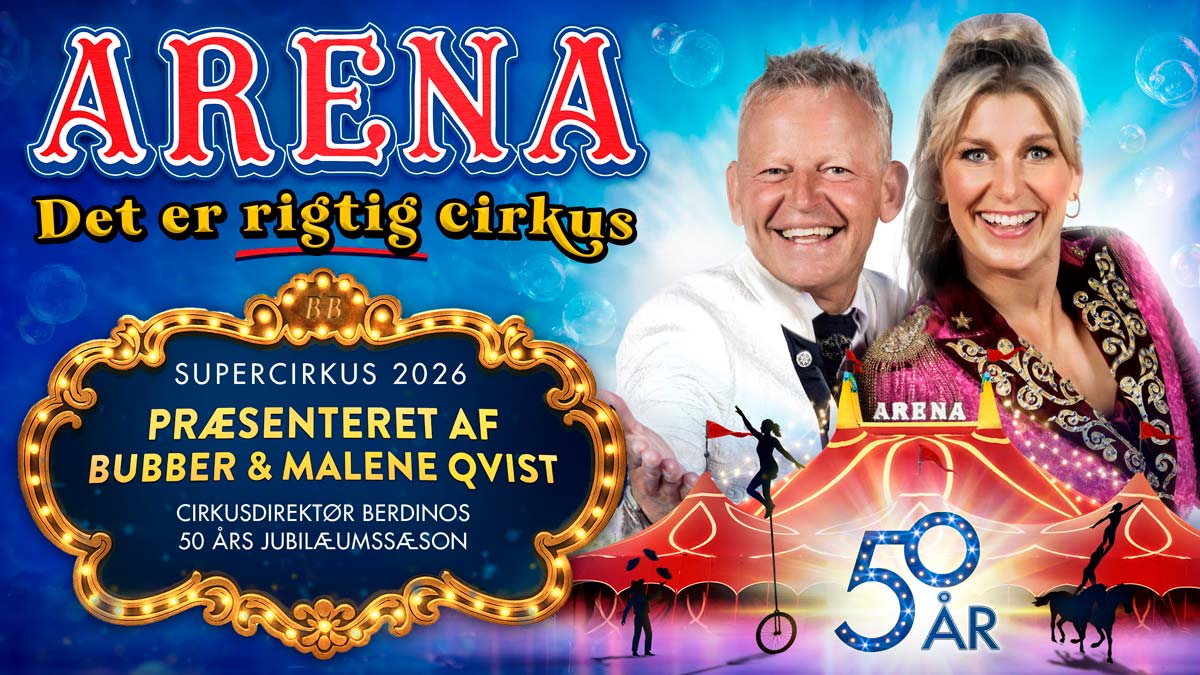 De seneste tre sæsoner har Cirkus Arena været det bedst anmeldte cirkus i Danmark, og i 2026 rykker vi endnu engang grænserne for, hvad der er muligt i en cirkusmanege, når Hanne og Benny Berdino fejrer 50 års jubilæum som cirkusdirektører med en festforestilling for hele familien.